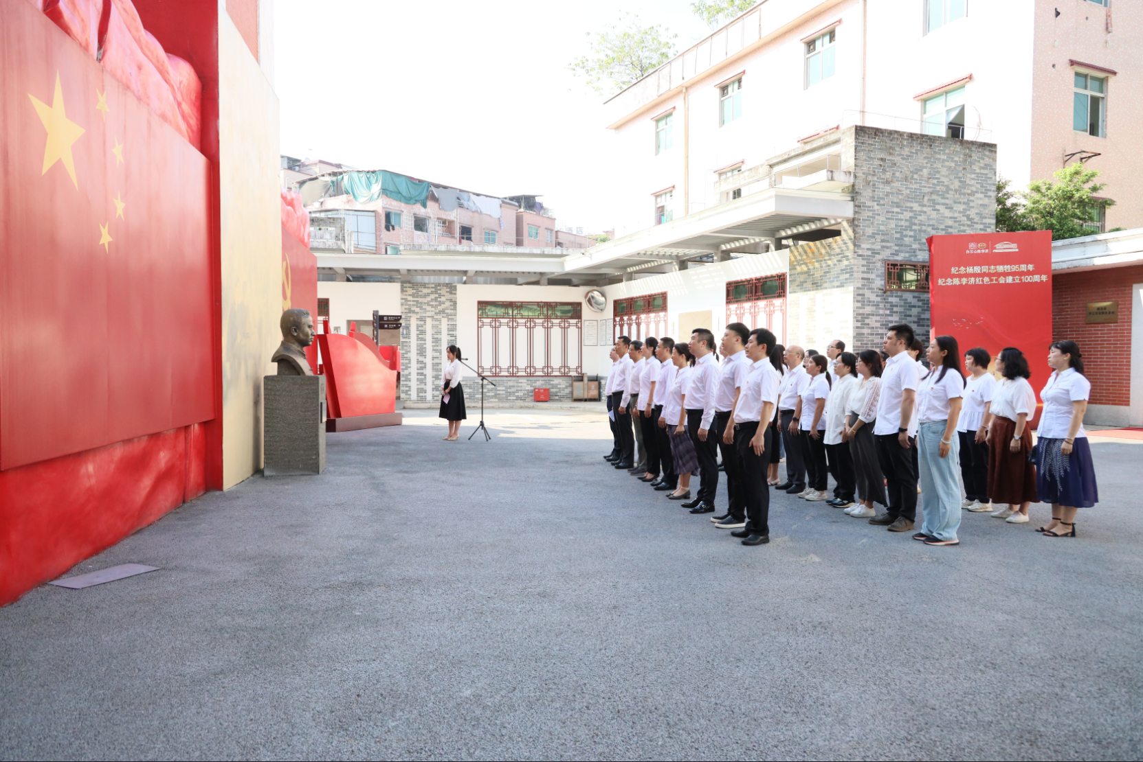 活动开始,陈李济党政领导班子带领陈李济党团员代表身着白衬衫,肃立于杨殷广场,面向国旗奏唱《中华人民共和国国歌》。国歌响起,激昂的旋律如同汹涌的波涛,席卷着革命的历史翻涌而来,中华儿女坚韧不屈的民族气节在旋律中缓缓流淌,先烈为国家和民族英勇捐躯、挥洒热血的场景仿佛就在眼前。