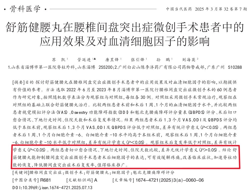 近日,由山东省淄博市第一医院与广州白云山陈李济药厂有限公司联合开展的一项临床研究取得重要成果。研究证实,陈李济经典中成药产品舒筋健腰丸在腰椎间盘突出症微创手术患者的术后康复中表现突出,不仅能有效缓解疼痛、加速脊柱功能恢复,还可显著降低术后复发率,相关成果已发表于《中国当代医药》2025年第7期。