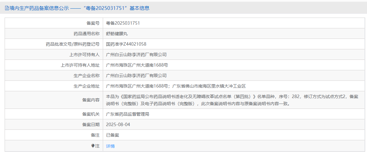 目前,陈李济已有舒筋健腰丸、壮腰健肾丸和昆仙胶囊等13个试点品种完成了说明书适老化备案,相关产品正陆续投放市场。