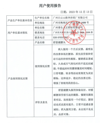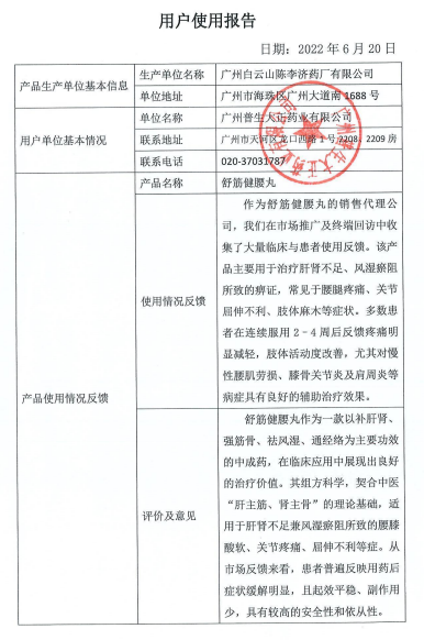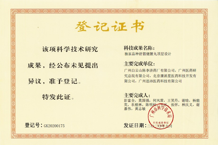 2016年,广州市产学研协同创新重大专项《独家品种舒筋健腰丸顶层设计研究》 再度获批。该项目从药材资源、工艺质量、安全性、药效学及临床研究等方面进行了全链条、系统性的深度研究,全面验证了产品的安全性、有效性与质量优势,实现了从“经验用药”到“科学用药”的跨越,相关成果获广州市科技成果登记。