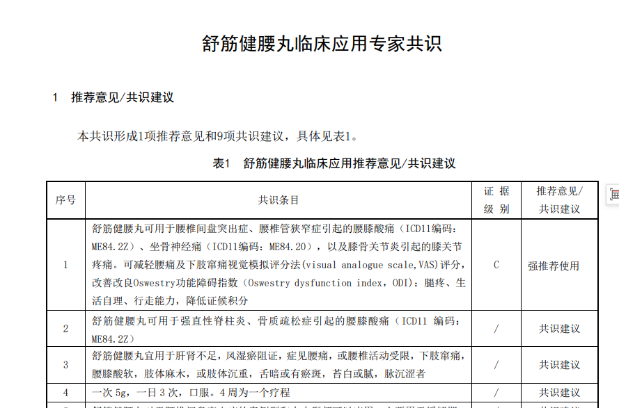 • 核心共识确立地位:2020年,首部《舒筋健腰丸临床应用专家共识》正式发布,明确指出舒筋健腰丸可用于腰椎间盘突出症、腰椎管狭窄症引起的腰膝酸痛及坐骨神经痛,以及膝骨关节炎引起的膝关节疼痛(证据级别C,强推荐),并扩展用于强直性脊柱炎、骨质疏松症引起的腰膝酸痛(共识建议)。共识认可其与非甾体抗炎药联用,体现了在现代综合治疗方案中的重要价值。2023年再度入选《腰椎间盘突出症中西医结合诊疗专家共识》,标志着其在骨伤科主流治疗领域的学术地位不断巩固。