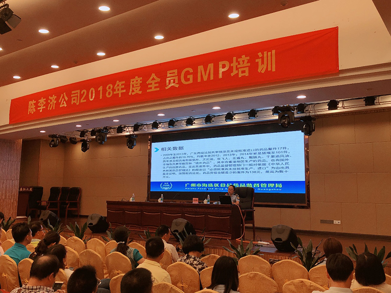 培训内容分为两部分,第一部分是安全方面的内容,邀请了广州市安监局朱华处长讲授消防安全知识,并安排安全保卫部林秉坤讲授安全生产及职业卫生知识。第二部分是GMP方面的内容,邀请了海珠区食品药品监督管理局程敏珊专家讲授GMP相关药证法规,副总经理莫国强讲授质量相关知识,质量管理部刘炜讲授质量意识及质量管理要求,GMP办公室王凌伟讲授GMP基本知识。