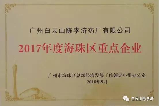 近日,白云山陈李济获海珠区认定为“2017年度海珠区重点企业”,陈李济已连续多年获此殊荣。