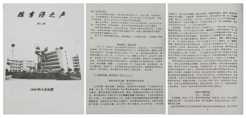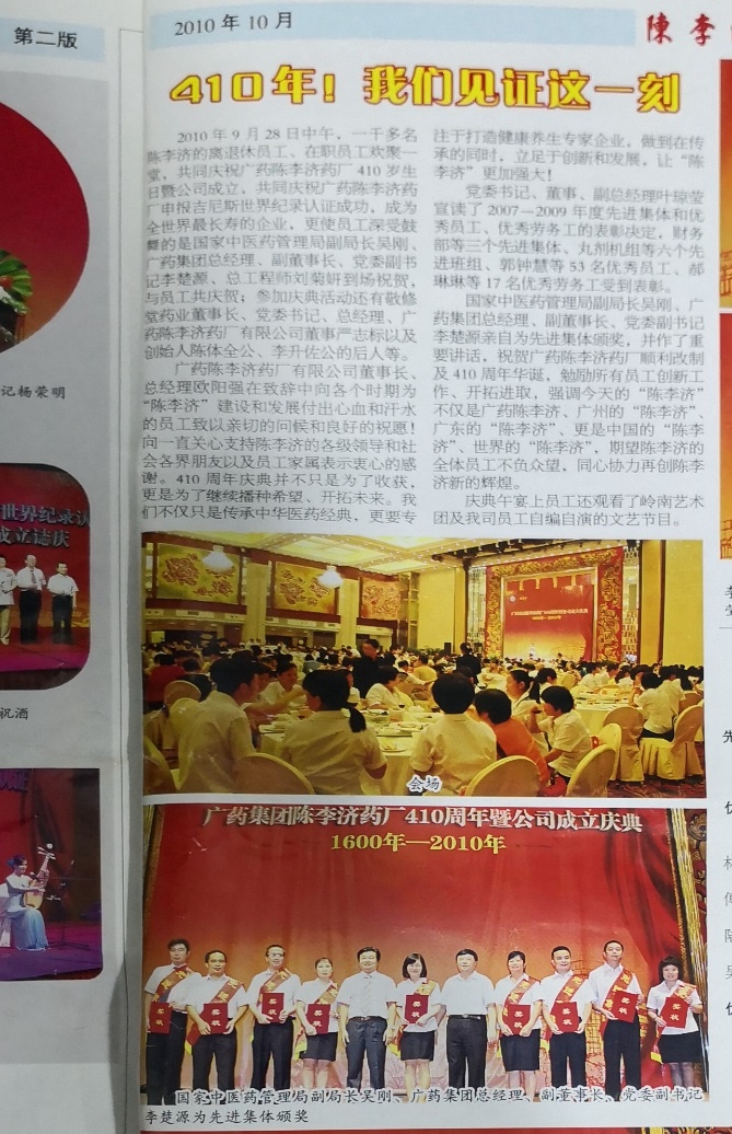 随后厂刊《陈李济之声》也迈向新台阶,改为《陈李济》厂报,光电带来了新时代,从誊写油印到报纸印刷,泛黄的油印纸换成光滑的铜版纸。2010年,1000多名陈李济离退休员工、在职员工欢聚一堂,共同庆祝410生日暨公司成立,庆祝申报吉尼斯世界纪录认证成功,成为全世界最长寿的药企。410周年不只是为了收获,更是为播种希望、开拓未来。图文并茂、色彩醒目的报纸令职工耳目一新,离退休的员工每月在家里就可以收到报纸,了解企业的生产经营状况,也为我们的历史留下了烙印。