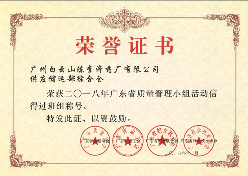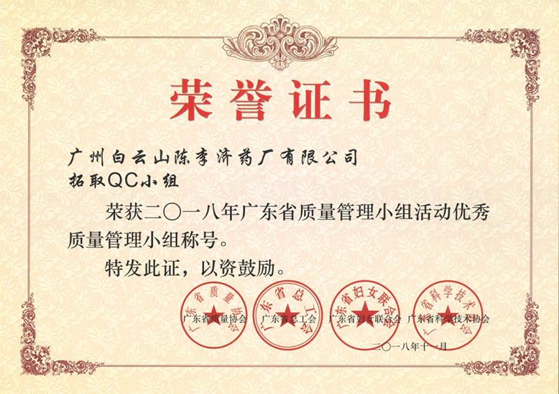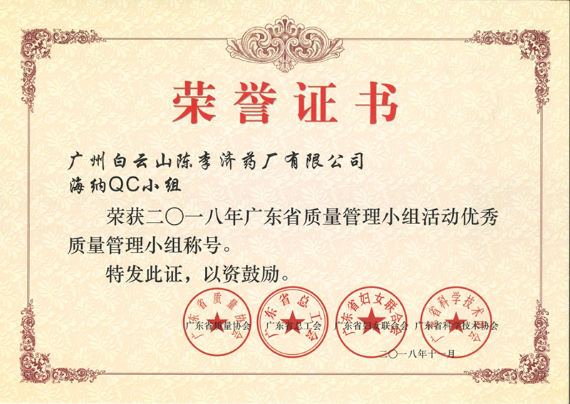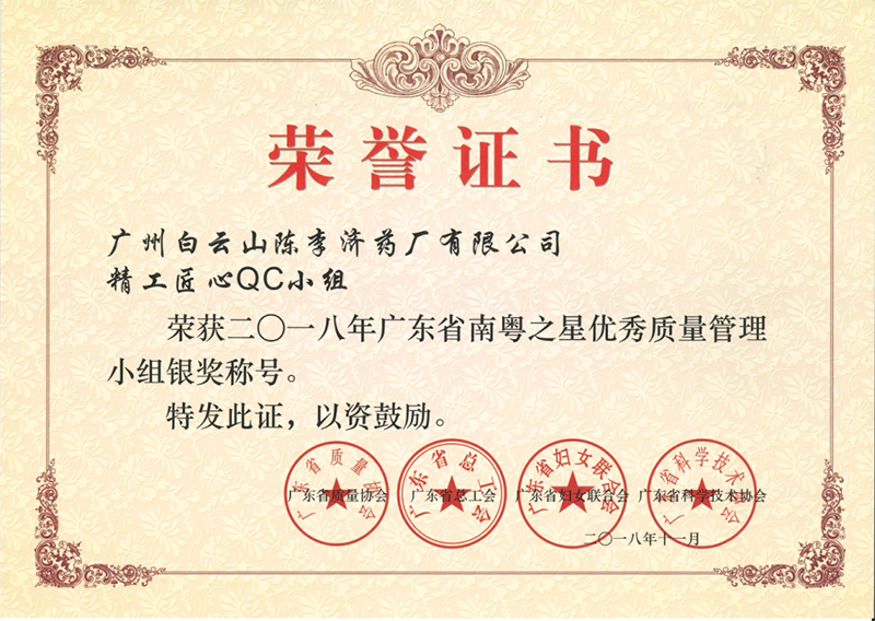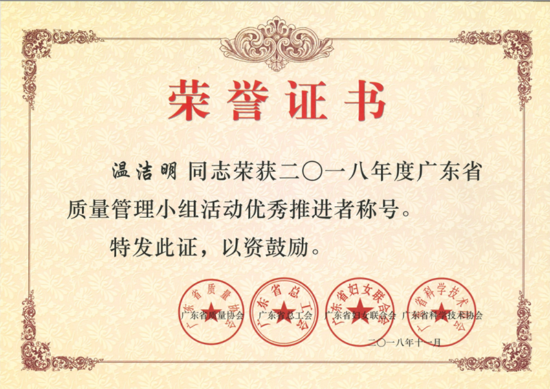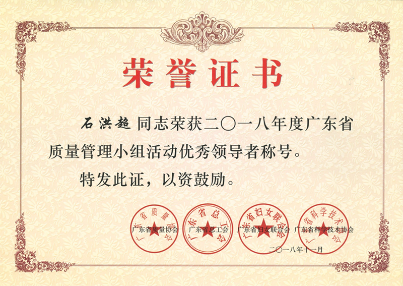 广东省质量协会近日颁发给我司的证书主要有:质量管理小组活动优秀企业、优秀领导者、优秀推进者、南粤之星金奖银奖、信得过班组、优秀QC小组等十项荣誉。