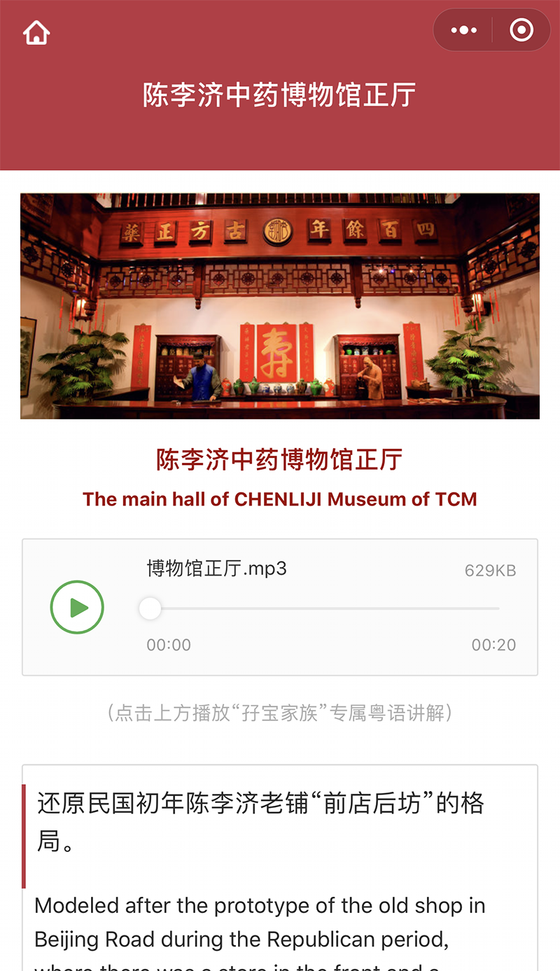 陈李济中药博物馆作为全国中医药文化宣传教育基地、广州市爱国主义教育基地、广州市科学技术普及基地、广州小记者研学实践基地、广州市海外华裔青少年中华文化传承基地、广东省工业旅游示范基地、广东省中医药文化养生旅游示范基地、多家大中小学社会实践基地等,其承载着艰巨的传播传统中药文化和爱国主义教育、革命主题教育、党廉主题教育、科学普及教育的重要使命。陈李济中药博物馆自建成开放以来已有十余载,访客流量日渐增加,陈李济中药博物馆与时俱进推出“二维码导览系统”,为更多游客民众提供自助讲解,其中博物馆的在线语音由“孖宝家族”为陈李济专门录制。