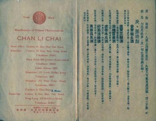 ▲《陈李济良药集》中,以英文刊登陈李济总行、国外支行的地址和电话号码。(图片采自《2012广州市第三届广府文化节:医药文化传承》第26页)