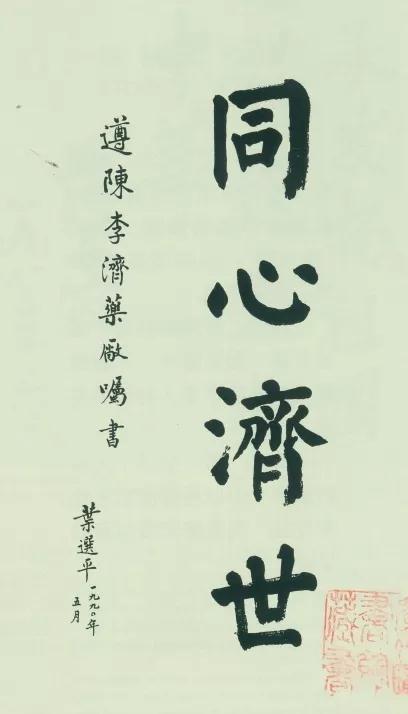 ▲1990年5月,时任广东省省长叶选平题写的“同心济世”。(图片采自《广州陈李济药厂建厂三百九十周年纪念:[中英对照]》第3页)