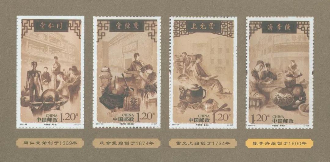 ▲中国集邮总公司于2010年11月20日专门为四大中药老铺发行的《中医药堂》特种邮票一套四枚,分别是同仁堂、庆余堂、雷允上和陈李济。这是卖一送三的节奏吗?(图片采自《南药瑰宝陈李济:健康养生四百余年》第23页)