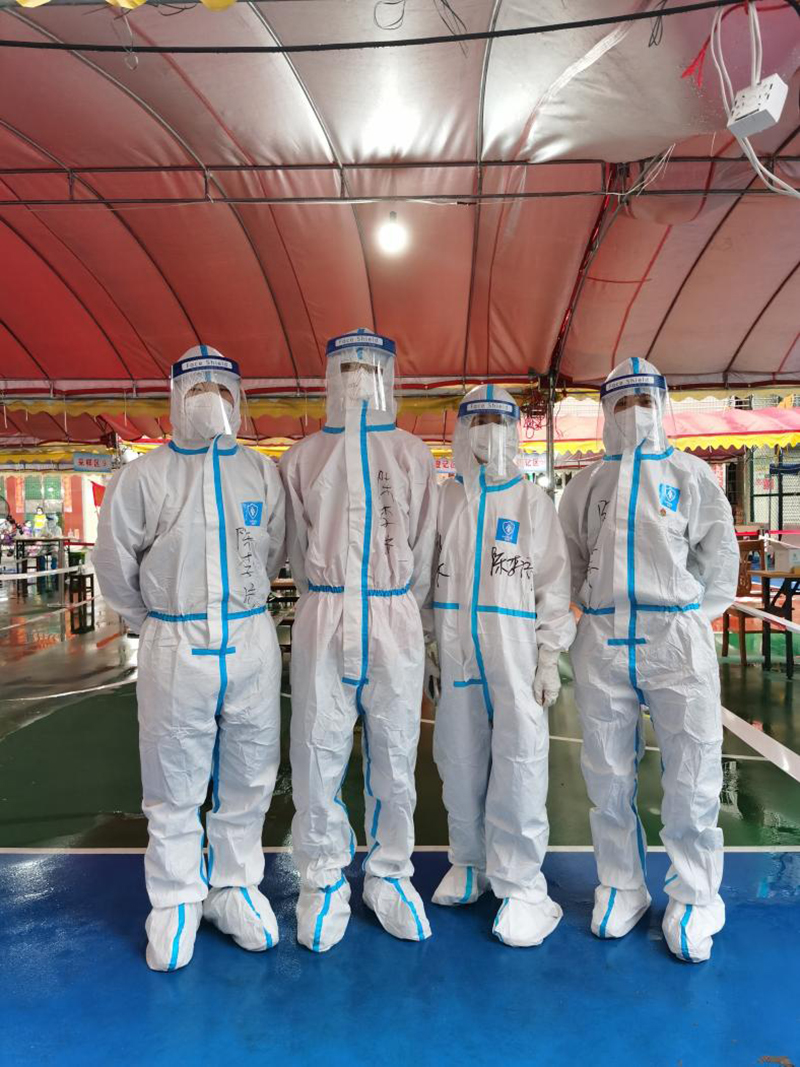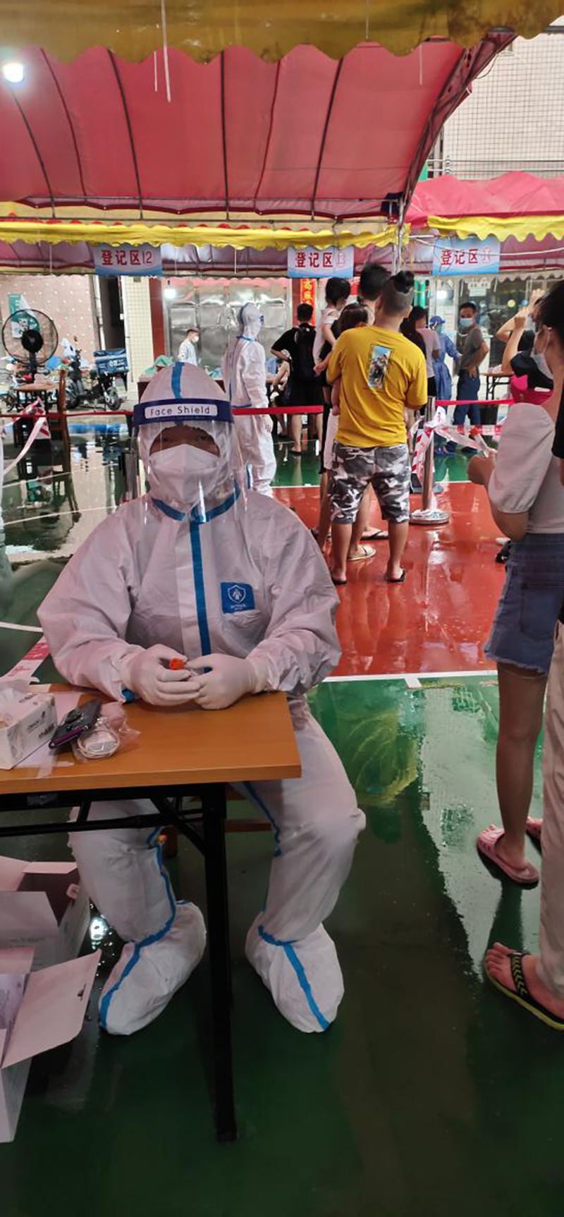 在北联村核酸检测维持秩序的现场,我们看到了一个美丽而熟悉的身影,她就是我们的入党积极分子王敏。当穿上防护服时那一瞬间,觉得防护服如千斤重一般,闷热感随之而来,汗如雨下,感觉自己的呼吸越来越吃力,但王敏内心的想法就是“忍”。经过4~6个小时的志愿服务,脱下防护服的她,内层衣物早已被汗水所浸湿,脱下手套,双手已经被汗水所泡白。虽然是累,但在工作期间,质朴的村民对她的工作竖起大拇指时,所有的疲惫和不适感都消失了。王敏说:“在这场战役中,我们都是战士,不管任何艰难险阻,我们都要勇往直前的战胜它。”