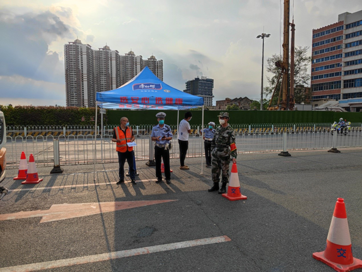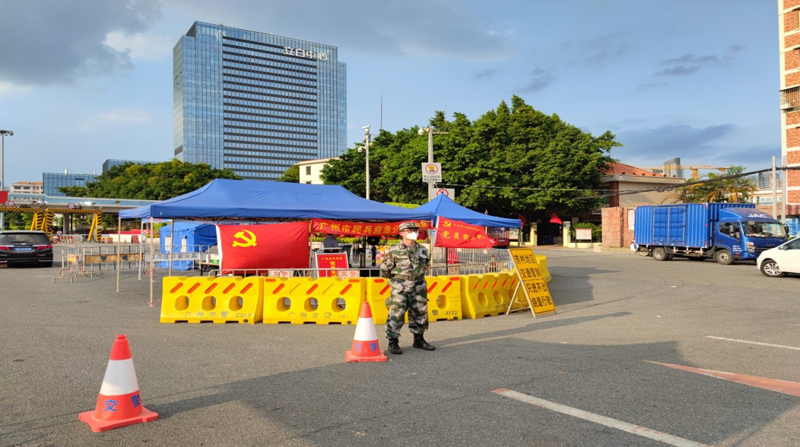 赵指导振奋说到:广药民兵全员到齐,我们迅速整好队列后背上军用背包前往番禺民兵基地,然后有秩序地测核酸,在等结果的途中,我们席地而坐吃份简便快餐同时开了动员大会,武装部处长告戒我们一定要做好自我防护,进入高、中风险严格按“最高级别”穿戴全套防护装具,要密切关注自己身体状况变化,一旦身体不适请立即轮换休息并就近就医,在确保自身安全的情况下,再继续战斗。切记:“只有首先保护好自己,才更好地帮助他人” 核酸结果出后,我们火速前往荔湾芳村各个关卡点, 我们的主要任务是在4个高风险区域的11个执勤点,把卡口管住、到疫区巡逻、帮忙转运物资、现场维持秩序、查验劝离违反防疫规定闯入禁区的群众,辅助警察做好抗疫围闭工作。 第一天,我们从晚上的10点开始,一直持续到第二天的中午12点,连续工作14小时,在值守的过程中,很多群众不断尝试走出封闭区,都被我们一一劝返,大家连续30小时没有睡眠,每个人都很疲惫,简单洗涑后就休息去,养足精神继续工作。