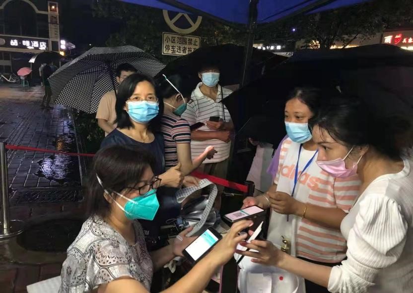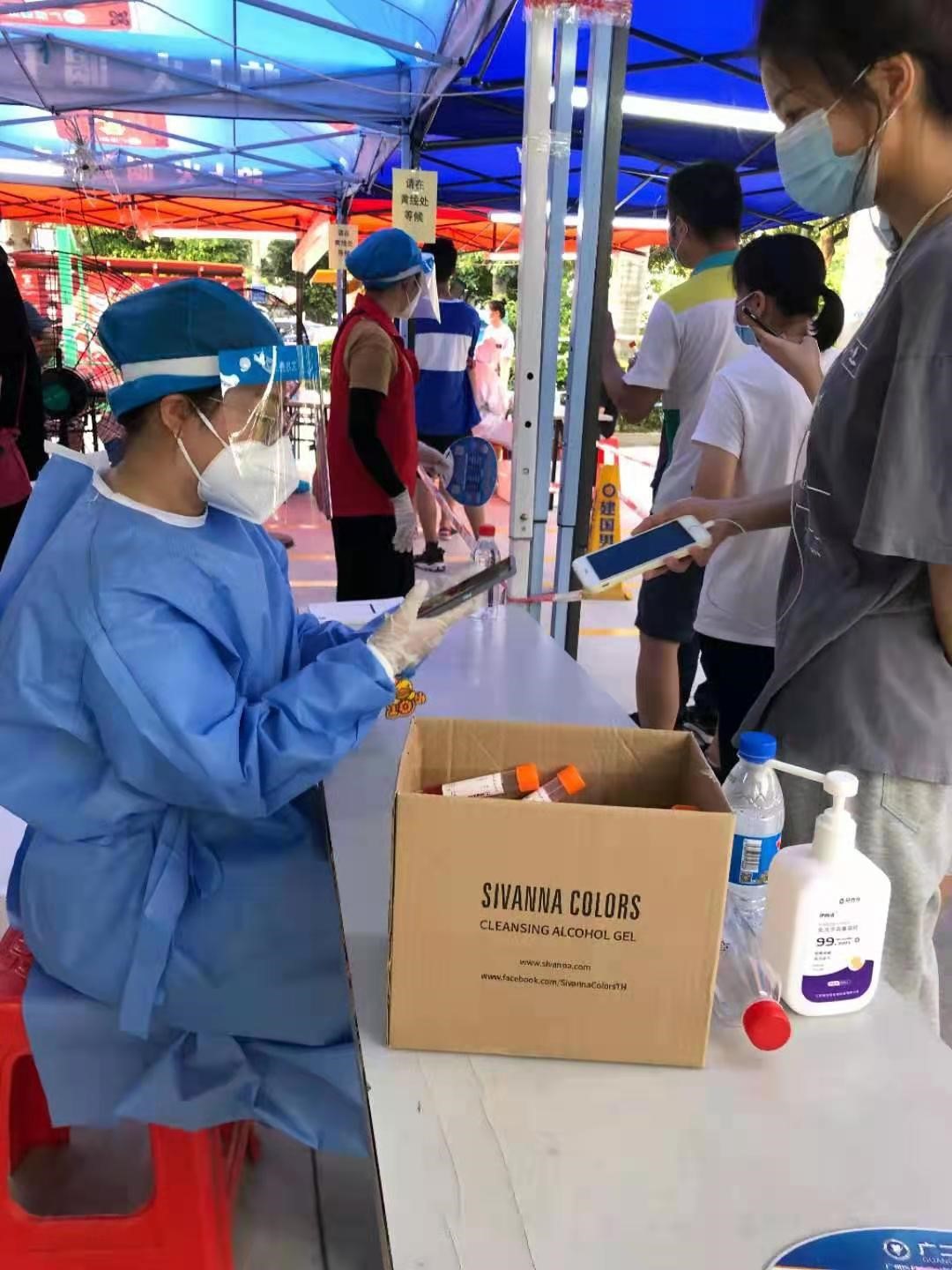 5月31日傍晚,陈李济党员刘丽梅参加了天河区华标社区的核酸检测工作。到达现场后她急忙接替了一位‘录入信息’的志愿者,投入到简单又不简单的志愿服务中:手机扫码→核查信息→扫条形码→保存→将条形码交给市民。就这样,一遍一遍地重复着这些流程,雨水从遮雨蓬一侧斜飘进来,衣服被打湿了也顾不上;几个小时下来,口虽然干,但顾不上喝一口水,也不敢喝,怕上厕所;手机满格的电到最后近11点钟结束时,只剩下1%的电。