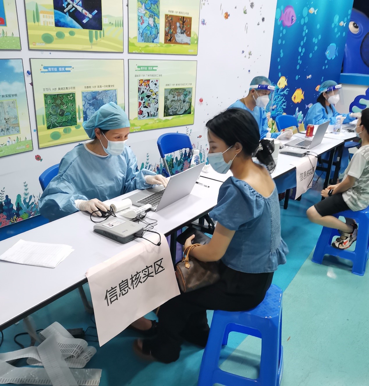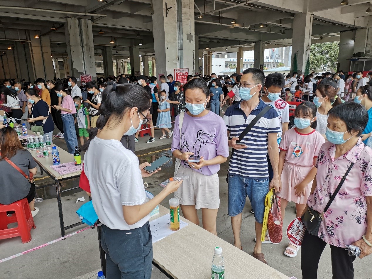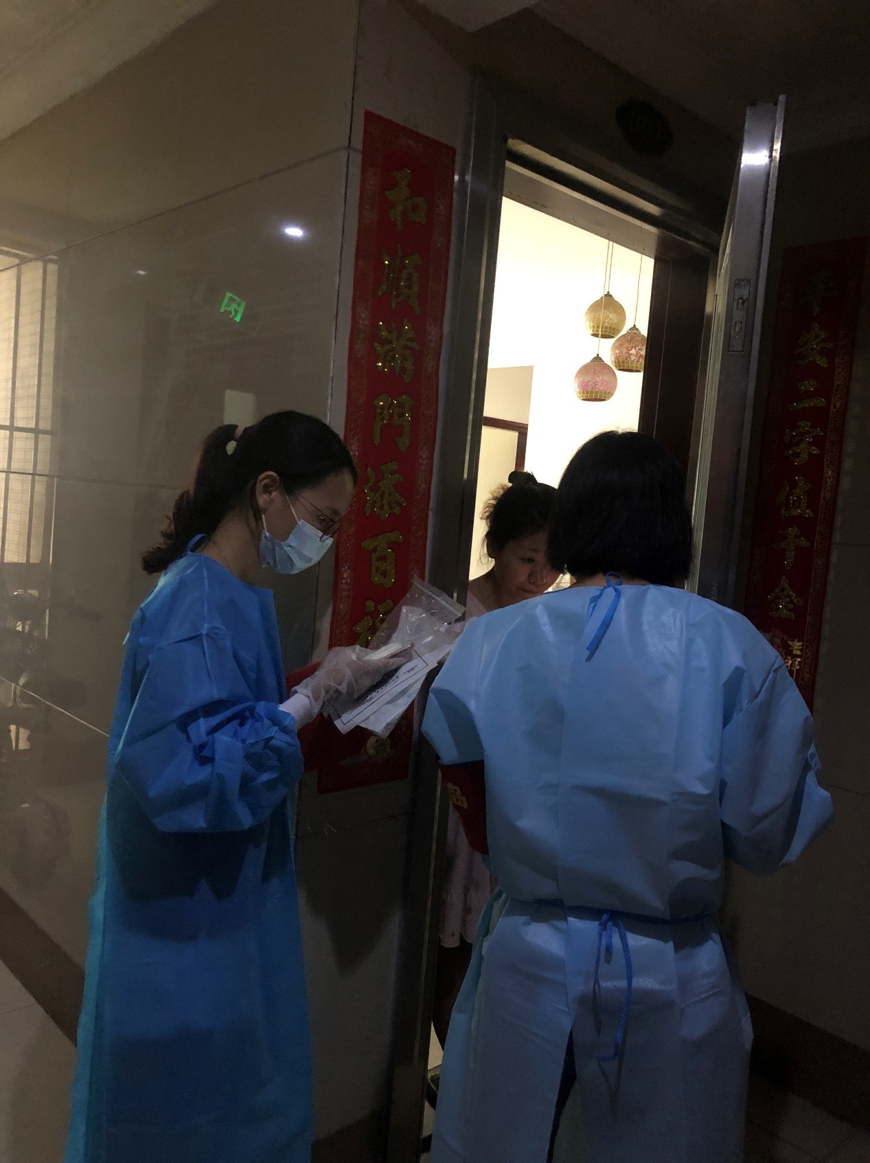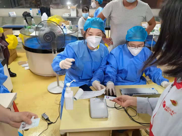5月26日荔湾区各街道将严格实行疫情防控管理措施,设立核酸检测点,确保做到应检尽检、不漏一户、不落一人。陈李济党员廖雪萍所属荔湾区故衣街社区,26日晚班后6点至9点,走街串巷扫楼从长乐路、杉木栏路、康王南路、和平中路环片,一家一户通知到文化公园进行核酸检测,并在现场指示维持秩序,服务人数约500人。27日晚又参加文化公园的核酸检测志愿活动,身着闷热防护服,为前来检测的居民核实信息。