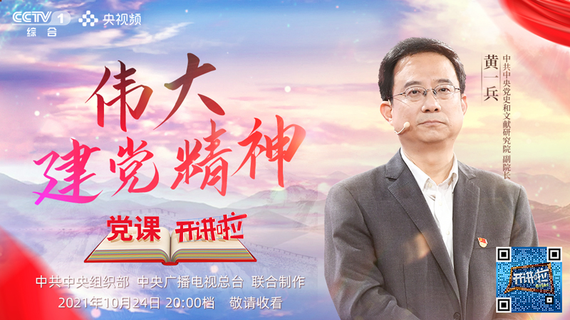 10月24日晚8点,中央电视台综合频道(CCTV-1)播出《党课开讲啦》节目第二期《伟大建党精神》,邀请中共中央党史和文献研究院副院长黄一兵,沿着历史的道路,讲述伟大建党精神,为大家诠释中国共产党的精神之源。