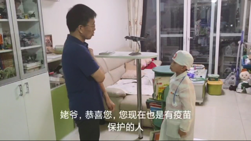 受爸爸妈妈的影响,8岁的大儿子十分关注疫情变化,邀请姥爷一起在家里录了一个宣传老年人打疫苗的视频。(视频点击播放)3岁大的小儿子也在旁边关注、模仿哥哥的一举一动。