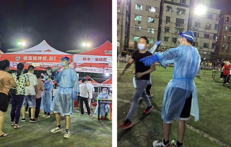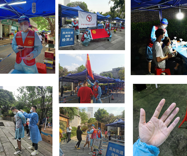 进入4月,散状多发的疫情形势给广州带来新一轮严峻考验。4月10下午,结束一天加班的杨永成脱下实验服就自愿前往凤阳街道鹭江球场核酸检测点进行支援,到达现场看到长长的待检群众队伍和汗流浃背的忙碌的工作人员后,他立马穿上防护用具投入到紧张的工作中。由于鹭江球场检测点受检民众较多,这次志愿服务一直持续到凌晨一点多,他坚持到最后总共服务了近8小时。他用自己的实际行动向党员的初心与使命看齐,展现了当代青年的责任与担当。