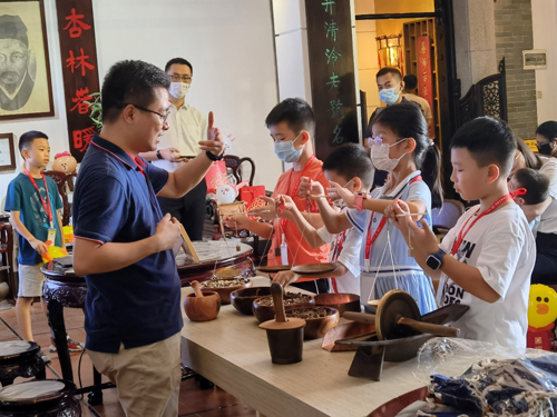 参观结束后,少年儿童们在陈李济中药博物馆内进行“陈李济陈皮中药香囊非遗体验活动”,讲解员通过中药的药用价值、制药工具及制药过程进行沉浸式体验活动,让大家亲自动手通过中药材的称量、研磨、捣药等制药工艺实践体验制作陈皮中药香囊,家长与孩纸们纷纷表示亲手制作中药香囊很有实践学习意义。