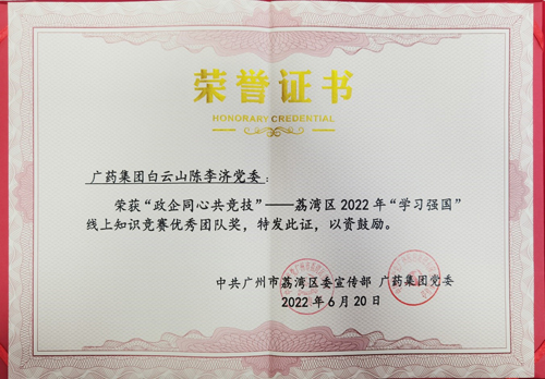 广药集团白云山陈李济公司党委获“政企同心共竞技”——荔湾区2022年“学习强国”线上知识竞赛优秀团队奖