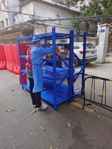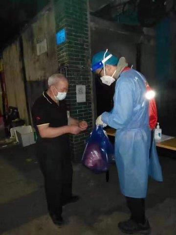 常年奔走在抗疫一线,经验丰富的中共党员“老大哥”吴广祺全程为队员保驾护航。他一遍又一遍地游走在各个值守点中,时刻关注大家的工作情况,保证物资供应充足。作为一个曾经在新疆值守两年的退役军人,他顽强的毅力和昂扬的精神状态深深激励着其余四位队员,断裂的水马扎带逃不开他鹰一样敏锐的眼神,沉甸甸的食材总是被他稳当当地提起,完好无损地送入居民手中。