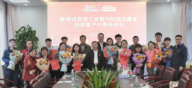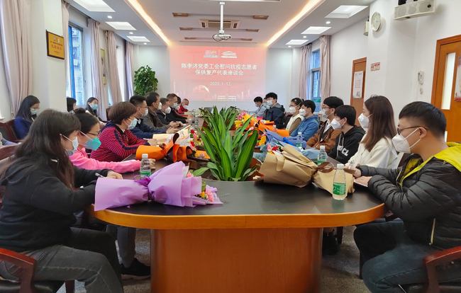 2023年1月12日下午,陈李济公司党委、工会在二楼会议室召开慰问抗疫志愿者、保供复产代表座谈会,公司党书记、董事长石洪超,总经理孙东,党委副书记、工会主席陈进伟,相关部门负责人,参加广州各区抗疫支援的杨殷红色突击队员、保供复产代表,共25人出席了会议。