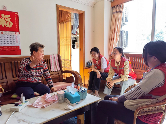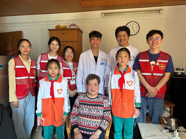 余德铭:在闲谈的过程中,我们了解到了胡婆婆的日常起居,以及她的一些身体情况,并与医护人员一起检查婆婆的血压,告知她一些在生活中该注意的事情。婆婆也非常的开心,跟我们分享了许多她年轻时知青的经历,向我们传递了积极乐观向上的精神!
