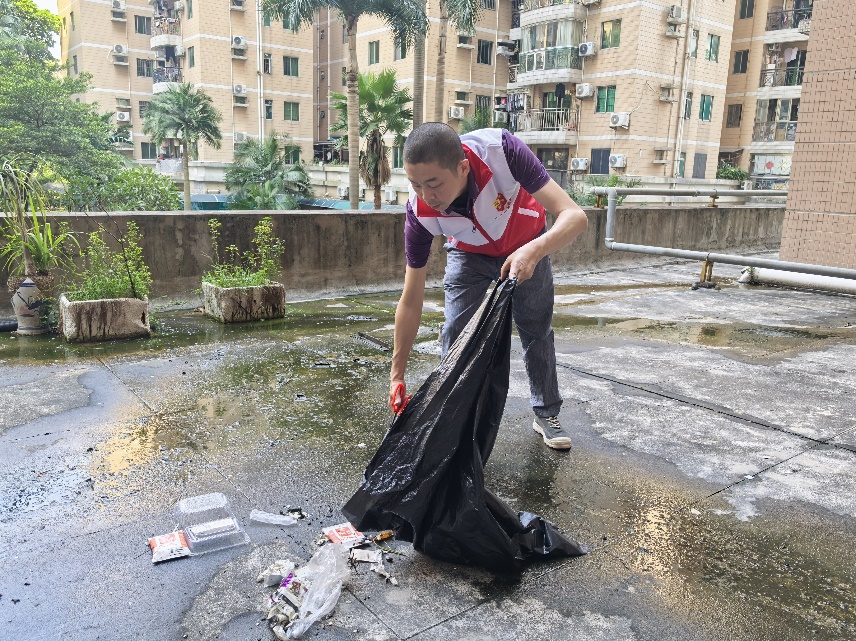 第八党支部党员黄志亮志愿服务的内容以上门宣传、发放灭蚊烟片及询问家庭人员健康状况为主,并联系社区物业人员对已知积水黑点及住户提供的卫生死角进行消杀,志愿服务当天开展“灭蚊”宣传达80户,做到室内户外相结合,有效有机防蚊灭蚊。何家豪到所在社区报到并开展志愿服务,其工作重点是排查处理小区内的“卫生黑点”,对天台花盆中的积水进行彻底清理,并向顶层住户宣传在天台种植时需注意的灭蚊要点,从细节处减少蚊虫滋生。党员吴广祺也积极行动,不仅参与防蚊灭蚊宣传活动,提高居民的防控意识,还对小区内有积水的黑点进行了全面打扫,将社区一楼的积水花盘全部翻转放置,从源头上消除蚊虫孳生地,为社区居民营造更安全的居住环境。