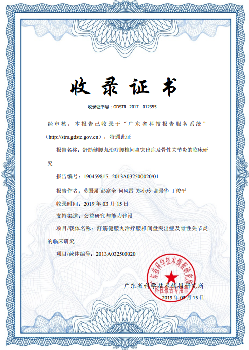 2016年,广州市产学研协同创新重大专项《独家品种舒筋健腰丸顶层设计研究》 再度获批。该项目从药材资源、工艺质量、安全性、药效学及临床研究等方面进行了全链条、系统性的深度研究,全面验证了产品的安全性、有效性与质量优势,实现了从“经验用药”到“科学用药”的跨越,相关成果获广州市科技成果登记。