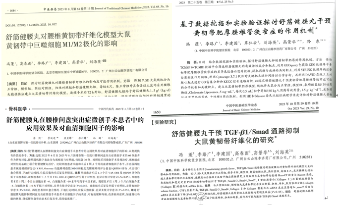 • 靶向黄韧带肥厚机制研究:针对腰椎管狭窄症的关键病理环节——黄韧带肥厚,研究基于生物信息学筛选与动物实验验证,首次揭示舒筋健腰丸可通过干预 TGF-β1/Smad 信号通路,有效抑制黄韧带成纤维细胞的异常增殖与胶原过度沉积,从而延缓或逆转黄韧带肥厚进程。同时,研究还发现其能调节局部巨噬细胞由促炎的M1型向抑炎的M2型极化,为缓解椎管狭窄提供了新的免疫学解释。