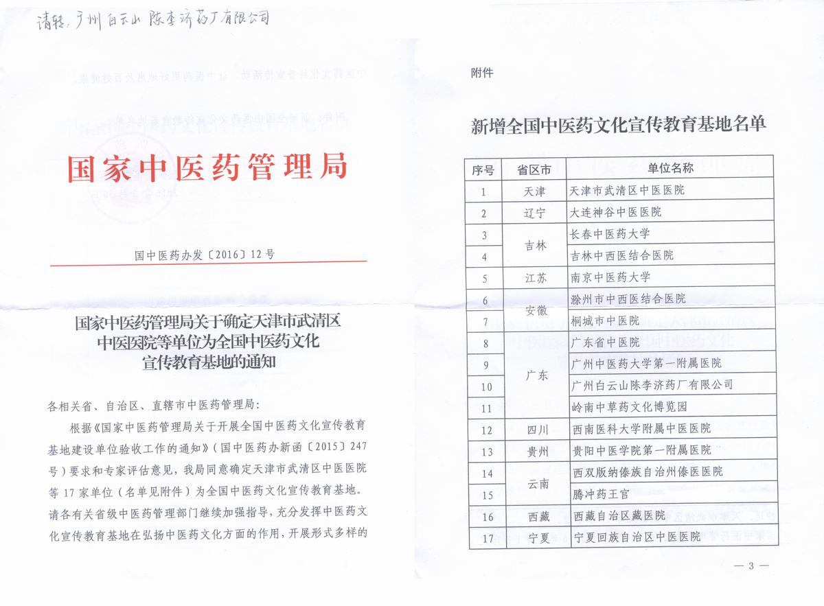 日,陈李济喜获“全国中医药文化宣传教育基地”。