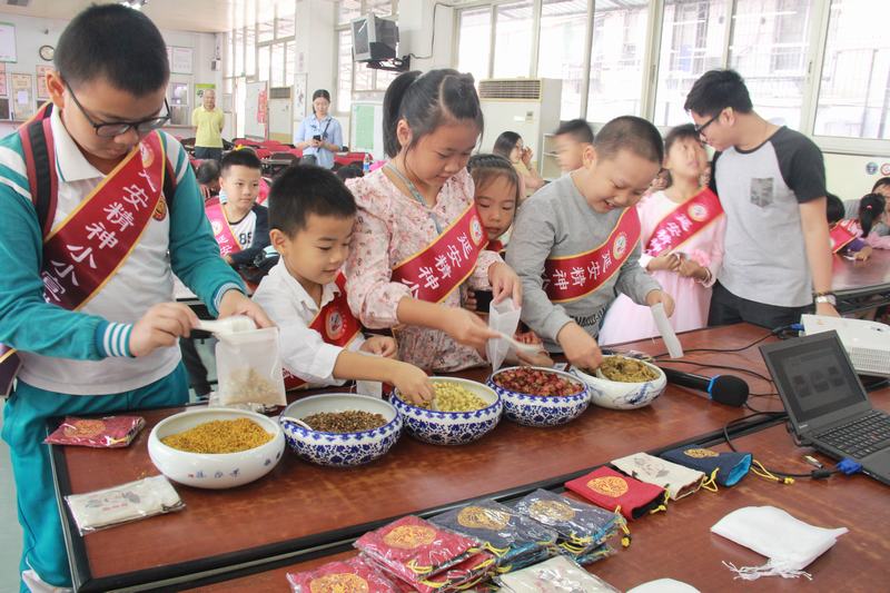 广州市延安精神研究会的小小宣讲员们在此次活动中观看了影片《探寻传承》,从历史的角度了解学习了陈李济四百年老字号屹立不倒的传统文化精神。此外,小小宣讲员们通过手工制作香囊,认识了传统中药材中的干花的功效。玫瑰花、桃花能美容养颜、行气活血,茉莉花对思虑型失眠有帮助,桂花可以对抗干燥秋季引起的上呼吸道咳嗽,起到止咳平喘的作用,而菊花不仅清热解毒,还可平肝明目。