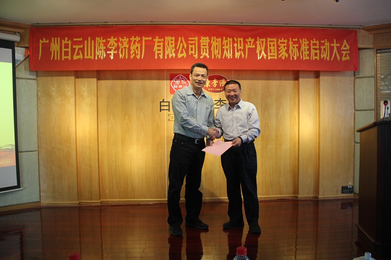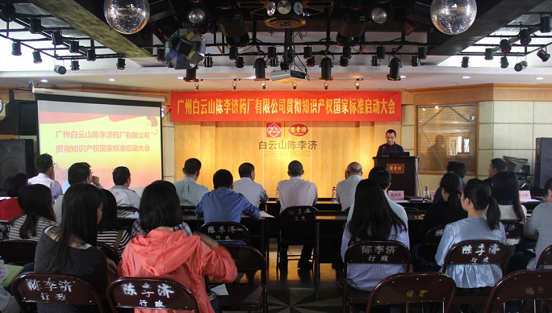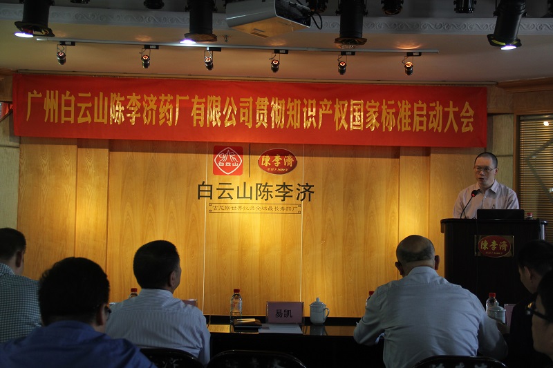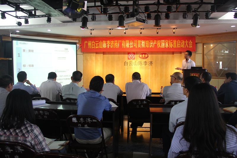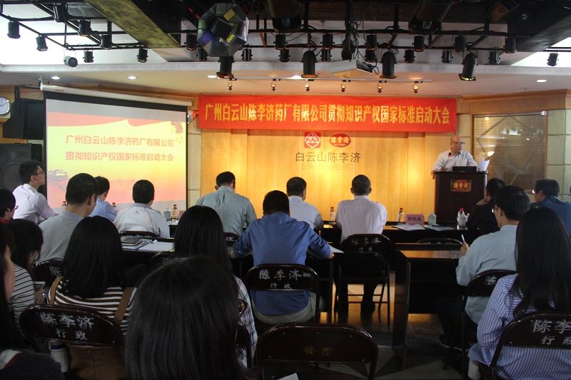 为了响应政府的号召,更好地贯彻《企业知识产权管理标准》(GB/T29490-2013),进一步提高企业的自主创新能力、知识产权运用、保护和管理水平,2017年11月1日上午广州白云山陈李济药厂有限公司在四楼职工之家召开了企业知识产权贯标启动大会,会议由莫国强副总经理主持,公司相关部门负责人和人员参加会议。公司石洪超党委书记董事长、梁铭基总经理、陈进伟党委副书记、纪委书记、莫国强副总经理、夏湘龙副总经理、广州市海珠区科技工业商务和信息化局易凯副局长、邓世彬科长等领导出席了启动大会。同时贯标辅导机构广州华进联合专利商标代理公司的吴师法律师、黎嘉炜、蔡文雅辅导老师出席启动大会并由黎嘉炜老师在会上做了贯标专题培训。