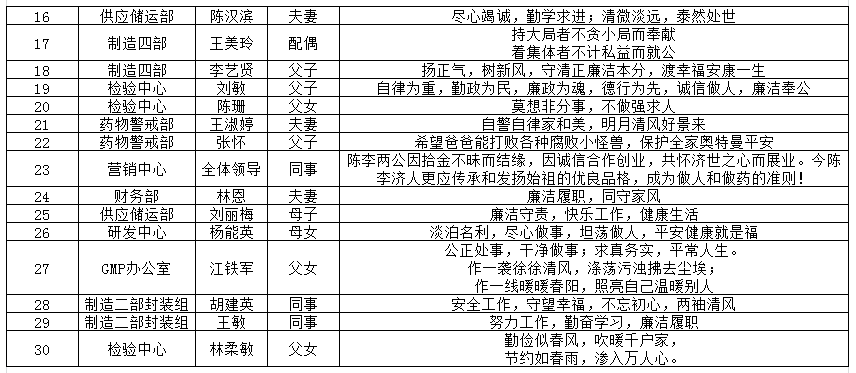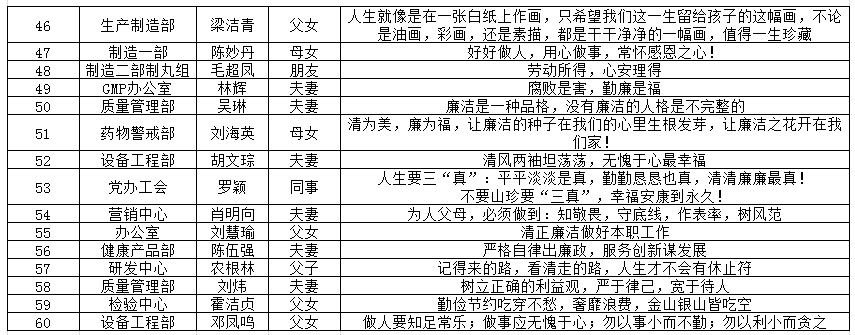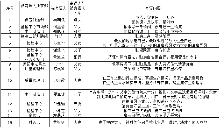 为贯彻落实十一届市纪委六次全会的决策部署,进一步加强国有企业廉洁文化建设,根据纪律教育学习月及廉洁文化进企业工作方案要求,2020年9月,白云山陈李济公司在全公司范围内开展“廉政亲情寄语”主题活动,共收集110条廉政亲情寄语。公司纪检部门联合党委办公室及各支部对提交作品进行评选,选出60条廉政亲情寄语,供员工及家属学习。
