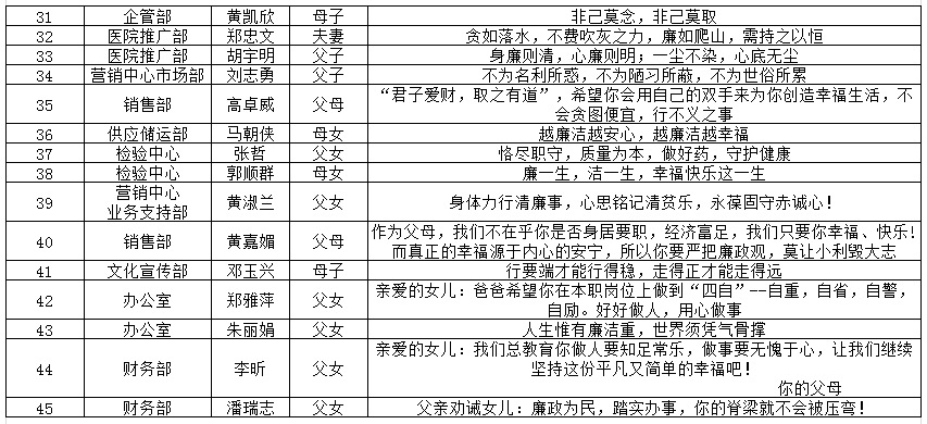 此次活动公司员工和家属互动和参与度较高,寄语既有职工的父母、配偶、子女等亲属对职工本人在工作、生活、学习、廉政、勤政等方面的廉政亲情寄语,也有长辈对晚辈的嘱托、嘱咐、激励和希望话等,寄语有的寓意深远、有的短小精炼、有的真诚朴实,起到了良好的廉洁教育宣传作用,筑牢拒腐防变的“家庭防线”,加强了企业风清气正廉洁文化的建设。