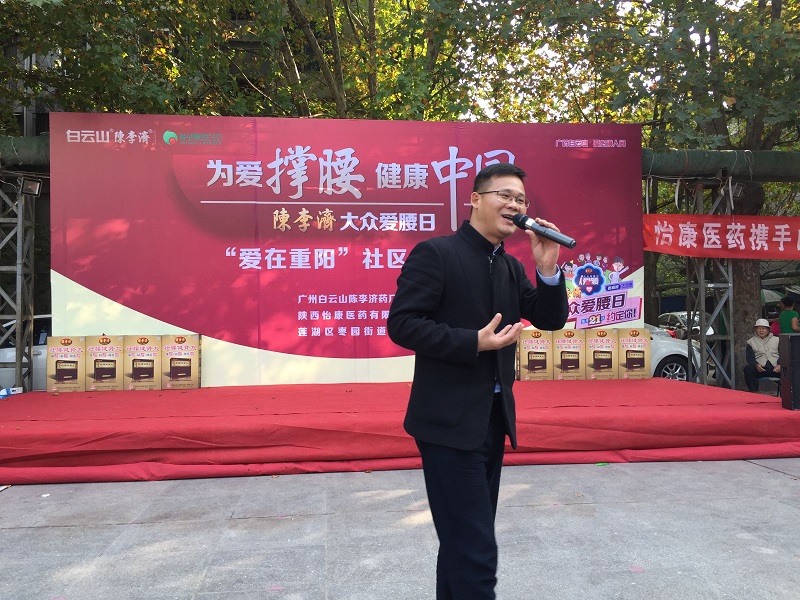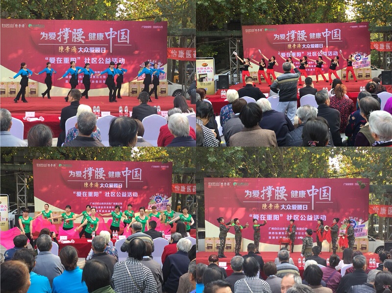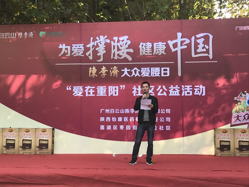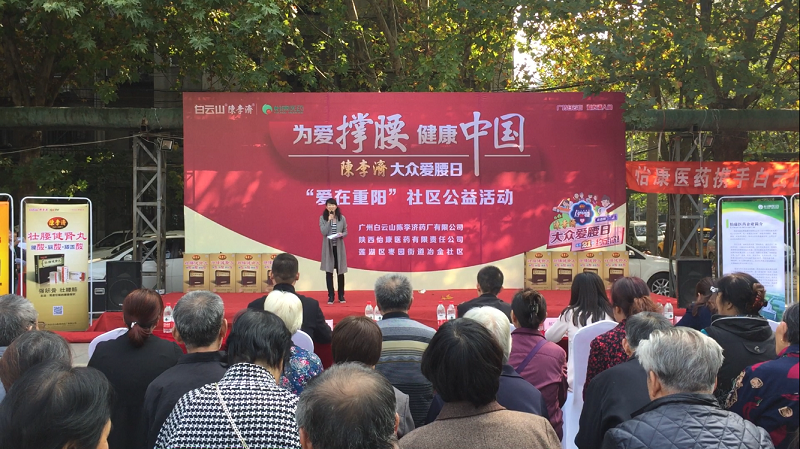 2017年10月27日下午,广州白云山陈李济药厂有限公司携手怡康医药连锁有限责任公司在西安市莲湖区枣园街道冶金社区举办了“为爱撑腰 健康中国”陈李济大众爱腰日之“爱在重阳”社区公益活动!